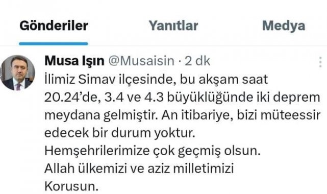 AFAD tarafından yapılan açıklamaya göre, saat 20.24'te meydana gelen 4,3 büyüklüğündeki depremin 13.43 kilometre derinlikte olduğu belirtildi. Kütahya Valisi Musa Işın, konuyla ilgili sosyal medya hesabından yaptığı açıklamada, "İlimiz Simav ilçesinde bu akşam saat 20.24'de 3,4 ve 4,3 büyüklüğünde iki deprem meydana gelmiştir. An itibarıyla bizi müteessir edecek bir durum yoktur. Hemşehrilerimize çok geçmiş olsun. Allah ülkemizi ve aziz milletimizi korusun" ifadelerine yer verdi.