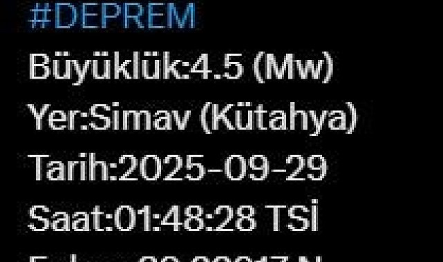 AFAD'ın paylaştığı bilgilere göre, Kütahya'nın Simav ilçesinde saat 01.54'te 4.5 büyüklüğünde deprem meydana geldi. Merkezi Simav ilçesi olan depremin derinliği 10.31 kilometre olarak ölçüldü.