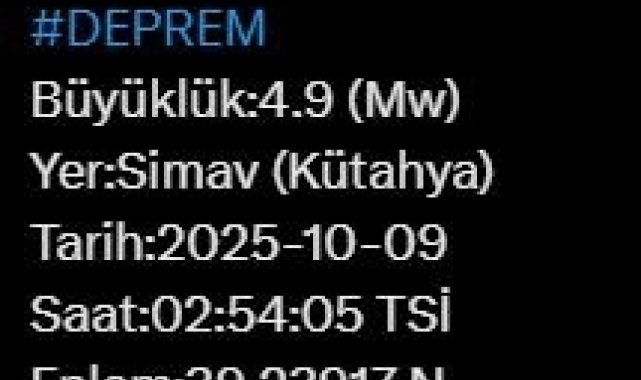 AFAD'ın paylaştığı bilgilere göre, Kütahya'nın Simav ilçesinde saat 02.54'te 4.9 büyüklüğünde deprem meydana geldi. Merkez üssü Simav ilçesi olan depremin derinliği 12.1 kilometre olarak ölçüldü.