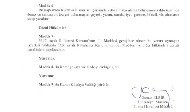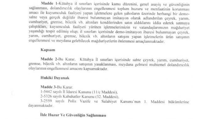 Konuya ilişkin açıklamada bulunan Kütahya Kuyumcular Odası Başkanı Ali Eğce, kararın sahte altınlarla yaşanan karışıklıkların önüne geçmek için önemli bir adım olduğunu belirtti. Başkan Eğce, "Valiliğin almış olduğu bir karar var. İmitasyon takılarda, yani ziynet grubu dediğimiz çeyrek, yarım, gram, tam gibi ürünlerde görünür şekilde demo ibaresi olmak zorunda. Aynı durum bilezikli ve kaplama ürünler için de geçerli. İmitasyona yasak gelmedi, hala satışı var ama üzerinde demo olarak yazacak" dedi.