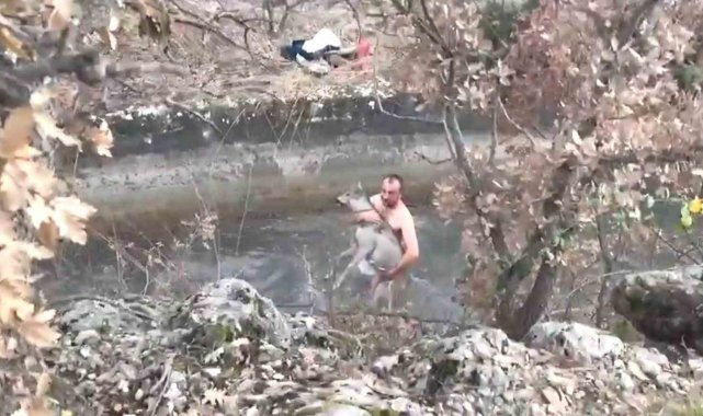 Kütahya'nın Gediz ilçesine bağlı Kayaköy'de hayvan severler, Hidroelektrik Santrali'ne su taşıyan kanala düşen karacayı yeraltı tünele girmesine 100 metre kala buz gibi suya girerek kurtardılar.