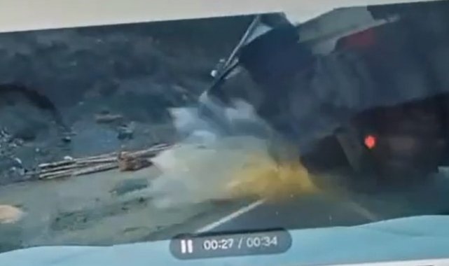 Kütahya'da tırın otomobilin üzerine devrildiği ve 1 kişinin öldüğü, 1 kişinin de yaralandığı trafik kazası araç kamerası tarafından saniye saniye görüntülendi.