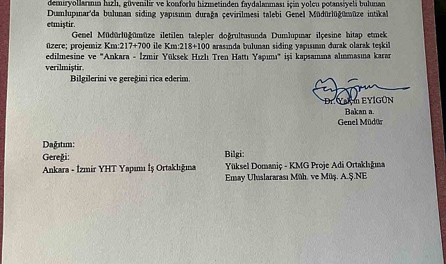 Işık, konuyla ilgili yaptığı açıklamada, "İlçemizde yapımı devam eden Ankara-İzmir hızlı tren hattının ilçemiz sınırları içerisinde durak yapılması için taleplerimizi AK Parti Kütahya İl Başkanımız Ceyda Çetin Erenler'e, milletvekillerimiz Adil Biçer, Mehmet Demir ve İsmail Çağlar Bayırcı'ya ilettik. Ulaştırma ve Altyapı Bakanlığımızın uygun görüşü ve Cumhurbaşkanımızın kararnamesi ile onaylanmıştır. Emeği geçenlerden Allah razı olsun. Bölgemize ve Dumlupınar'ımıza hayırlı olsun" ifadelerini kullandı.