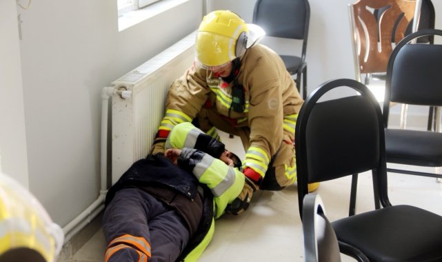 İç mekânda gerçekleştirilen senaryoda ekipler, duman altındaki alanda ilerleme tekniklerini kullanarak yangına kontrollü müdahalede bulundu. Ardından yaralı personel güvenli şekilde tahliye edilerek sağlık ekiplerine teslim edildi. Merdivenli araç kullanımıyla yüksek kat erişim çalışması da planlı ve disiplinli şekilde tamamlandı.