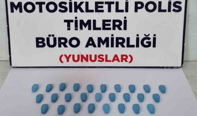Kütahya'da Motosikletli Polis Timlerince bir şahsın yapılan üst aramasında, 33 adet extasy hap ve 3 adet sentetik ecza hap ele geçirildi.
