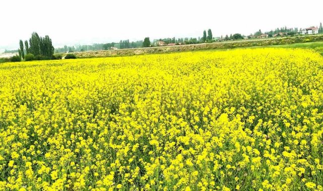 82. Yıl Mahallesi Sola mevkiinde yaklaşık 4 dönüm arpa ekili tarlada çıkan sarı renkli hardal otu göz kamaştırıyor. Arpa ekili tarlayı adeta sarıya boyayan hardal otu rengiyle görenleri hayran bırakıyor.