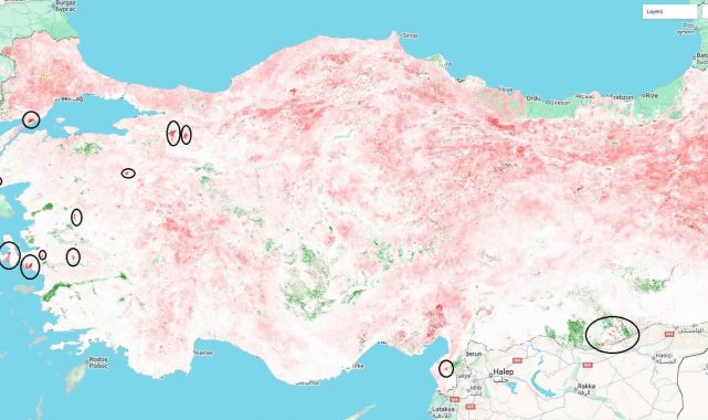 Geçtiğimiz aylarda yaşanan yangınlara işaret eden Kutoğlu, "Geçtiğimiz aylar içerisinde biliyorsunuz İzmir bölgesinde, Çeşme'de ve Seferihisar'da ciddi yangınlar olmuştur. Orada tabii bitki örtüsü ve su içeriği tamamen ortadan kalktığı için bunları koyu kırmızı görüyoruz. Yine Çanakkale'de, İzmit'te yanan bölgeleri koyu kırmızı olarak görüyoruz ama diğer bölgeler Türkiye'nin tamamına baktığınızda pembe, kızıla çalan renkler var. Yani ülke genelinde ciddi bir kuraklık söz konusu. Bitkilerde bu kuraklık nedeniyle su içeriğini kaybetmişler. Yani su stresine girmişler. Haritada yeşil alanlar var. Bitkilerin Haziran'dan Ağustos ayına yeşerdiğini, boylarının uzadığını, su içeriklerinin arttığını görüyoruz. Bunlar tarım alanları da olabilir veya su kenarlarındaki kendiliğinden gelişen mera alanları da olabilir. Bazı alanlarımızda da ama az sayıda da olsa bazı bölgelerde bitkilerin boy attığını ya da su içeriğinin arttığını görüyoruz. Onlar sağlıklı büyümelerini görüyoruz. O bölgelerde bitkiler sağlıklı gelişimlerini sürdürmüştür" diye konuştu.