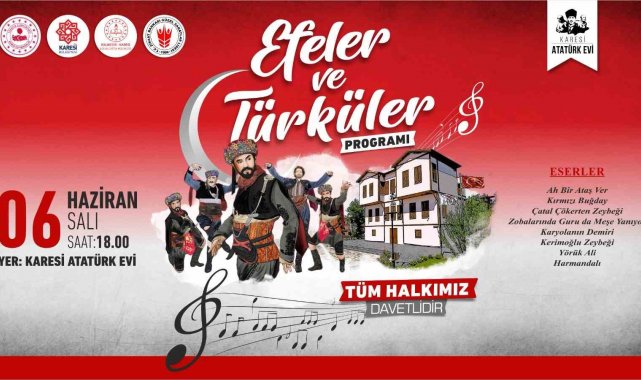 Kuva-yi Milliye şehri Balıkesir'e değer katan Karesi Atatürk Evi'nde "Efeler ve Türküler" programı düzenlenecek. 6 Haziran Salı günü gerçekleştirilecek olan programda T.C. Ziraat Bankası Güzel Sanatlar Lisesi öğretmen ve öğrencilerinin hazırladığı gösteriler sunulacak.