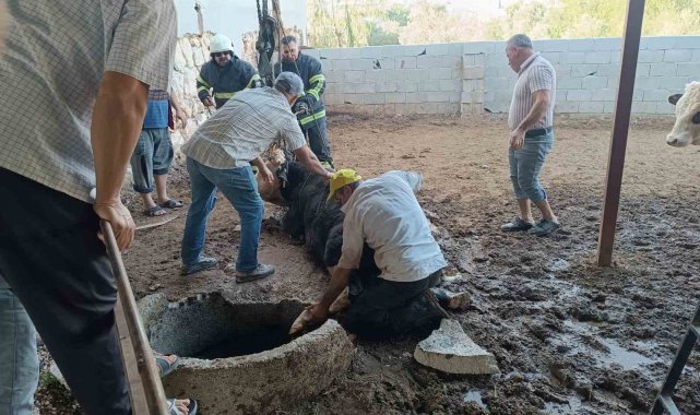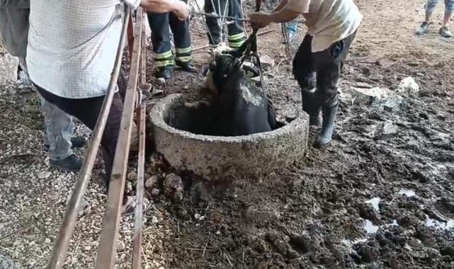 Hatay'ın Altınözü ilçesinde kuyuya düşüp mahsur kalan inek, itfaiye ekipleri tarafından kurtarıldı.