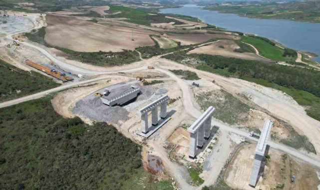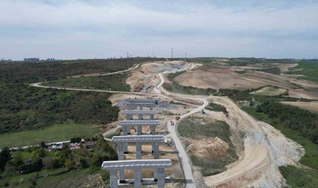 Köprü ve otoyol şantiyesinde dron ile çekilen görüntülerde köprü direklerinin 100 metre yüksekliğe ulaştığı ve üzerindeki yoğun çalışmalarının devam ettiği görüldü.