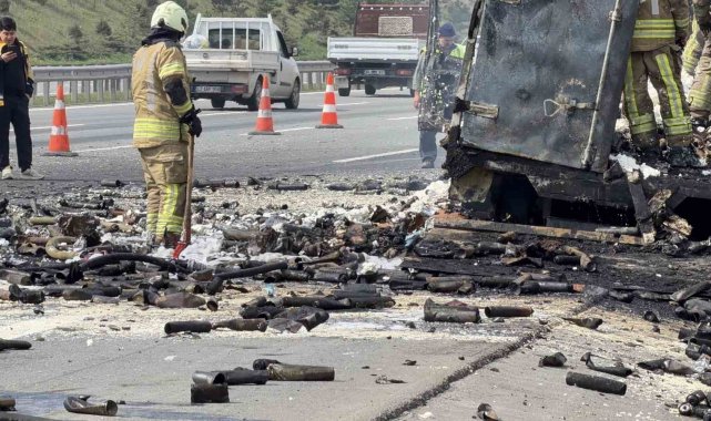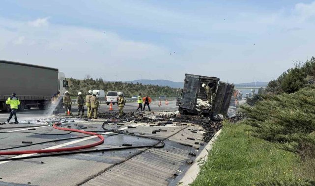 Kuzey Marmara Otoyolu'nda seyir halindeki köpük sprey yüklü kamyon, henüz bilinmeyen bir nedenle alev aldı. Kamyon kasasında bulunan spreylerin patlamasıyla otoyolda panik yaşanırken, yolun iki şeridi trafiğe kapandı.