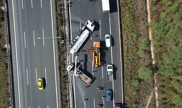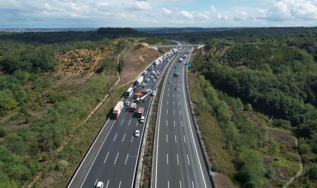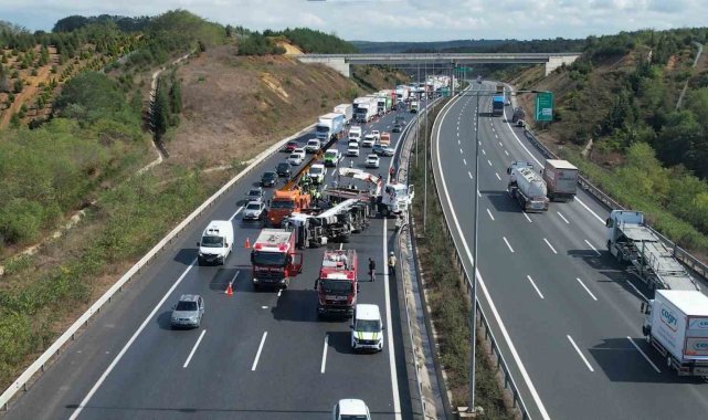 Kaza, saat 13.00 sıralarında Kuzey Marmara Otoyolu Riva mevkiinde meydana geldi. Edinilen bilgiye göre, Edirne istikametinde ilerleyen 34 MIL 075 plakalı tıra arkadan bir taksi çarptı. Çarpmanın etkisiyle direksiyon hakimiyetini kaybeden tır şoförü B.B., aracıyla bariyerlere çarparak devrildi. İhbar üzerine olay yerine polis, sağlık ve itfaiye ekipleri sevk edildi. Kazadan yara almadan kurtulan tır şoförü büyük şok yaşarken, takside bulunan sürücü ve yolcular da kazayı hafif sıyrıklarla atlattı. Kaza nedeniyle Kuzey Marmara Otoyolu'nun Edirne istikametinde kilometrelerce araç kuyruğu oluştu. Trafik dron ile görüntülenirken, devrilen tırın yoldan kaldırılması için çalışma başlatıldı.