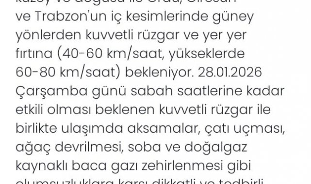 Meteoroloji Genel Müdürlüğü'nden yapılan açıklamaya göre, bugün akşam saatlerinden itibaren Samsun çevreleri ile Sinop ve Kastamonu'nun kuzeyi, Tokat'ın kuzey ve doğu kesimleri ile Ordu, Giresun ve Trabzon'un iç bölgelerinde güney yönlerden kuvvetli rüzgâr ve yer yer fırtına bekleniyor. Rüzgârın saatte 40 ila 60 kilometre, yüksek kesimlerde ise 60 ila 80 kilometre hızla esmesi öngörülüyor.