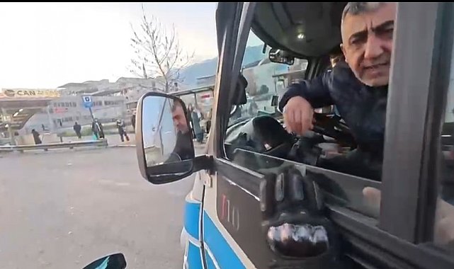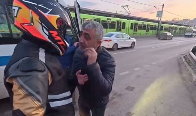 Bursa'nın Yıldırım ilçesi Arabayatağı mevkii Ankara Yolu üzerinde motosikletiyle ilerleyen Mert A., önüne minibüsü kırdığını iddia ettiği dolmuş şoförüyle sözlü tartışma yaşadı. Mert A.'nın, 'Lan' ne yapıyorsun' demesi üzerine deliye dönen sürücü gence tokat atmaya çalıştı. O anlar kameraya yansırken, taraflar arasında artan tansiyon sonrası, ikili araçlarından inerek sözlü tartışmaya devam etti. Deliye dönen sürücü, motosikletli gence, "Sen bir bayanın yanında nasıl 'lan' diyorsun, kendine yakıştırıyor musun ?" diyerek tepki gösterdi. Çevredekilerin araya girmesiyle taraflar ayrılırken, Mert A.'nın sürücüden şikayetçi olacağını öne sürdü.