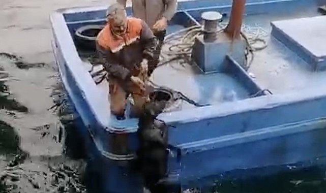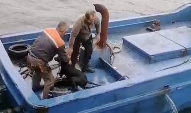 Çanakkale'nin Lapseki ilçesinde iskelede denize düşerek sürüklenen köpeğin yardımına balıkçılar yetişti. O anlar cep telefonu kameralarına yansıdı.