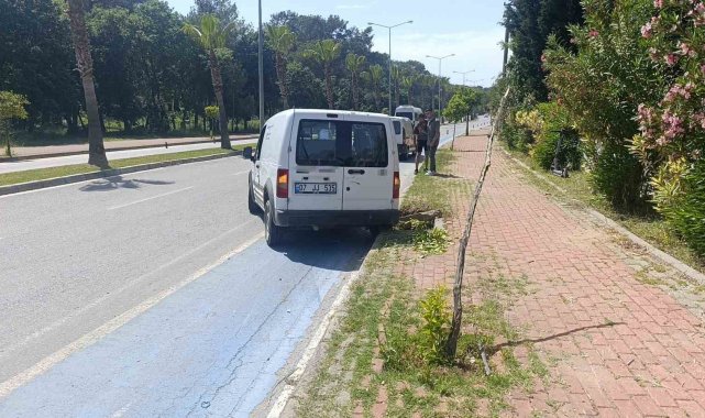 Antalya'nın Manavgat ilçesinde seyir halindeyken lastiği patlayan ve yoldan kaldırıma çıkan hafif ticari araç devrilmekten son anda kurtuldu. Araçta bulunan 2 kişi şans eseri kazayı burunları bile kanamadan atlattı.