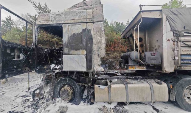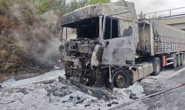 Bolu'da otoyolda seyir halindeyken tekerleği patlayan tır alev aldı. Alevlere teslim olan tır küle döndü.
