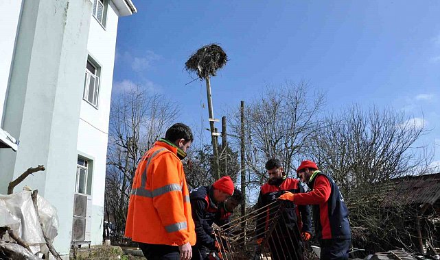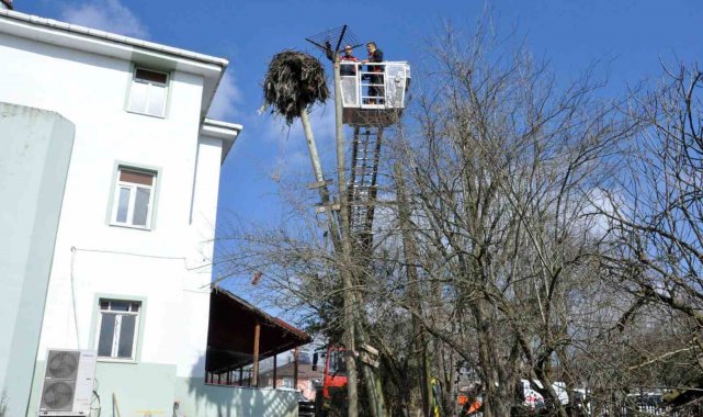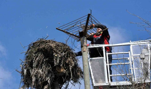 Kocaeli'nin Kandıra ilçesinde rüzgar nedeniyle eğilen ve yıkılma tehlikesi olan telefon direğindeki leylek yuvasının bakım ve onarımını gerçekleştirildi.