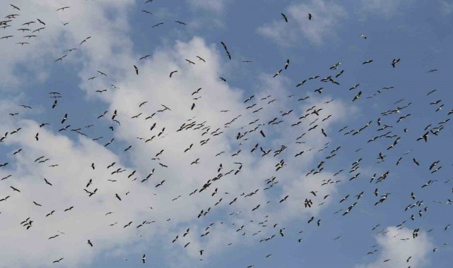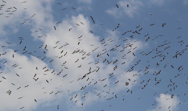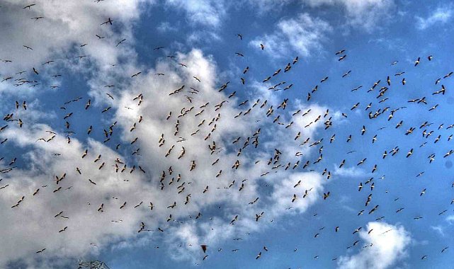 Yaz döneminin sonuna yaklaşılırken daha sıcak ülkelere göç etmek üzere yola çıkmaya başlayan leylek sürüleri Konya'nın Beyşehir ilçesinin semalarında görüntülendi.
