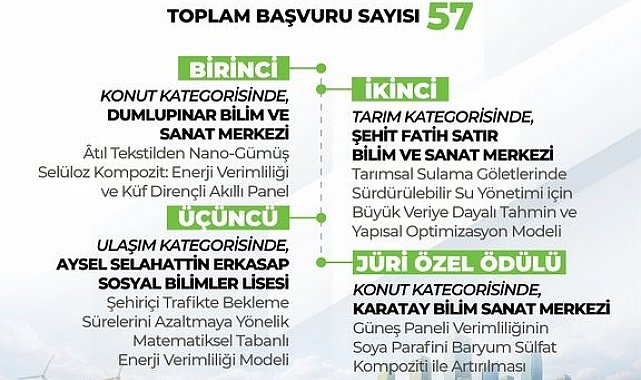 Yarışmada dereceye giren projelerden, 'Atıl Tekstilden Nano-Gümüş Selüloz Kompozit: Enerji Verimliliği ve Küf Dirençli Akıllı Panel' birincilik ödülüne layık görülürken, 'Tarımsal Sulama Göletlerinde Sürdürülebilir Su Yönetimi için Büyük Veriye Dayalı Tahmin ve Yapısal Optimizasyon Modeli' ikinci, 'Şehiriçi Trafikte Bekleme Sürelerini Azaltmaya Yönelik Matematiksel Tabanlı Enerji Verimliliği Modeli' ise üçüncü oldu. 'Güneş Paneli Verimliliğinin Soya Parafini Baryum Sülfat Kompoziti ile Artırılması' adlı proje de jüri özel ödülünü kazandı.