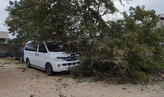 Bursa'nın Mustafakemalpaşa ilçesinde etkili olan şiddetli rüzgar, ağacı ve elektrik direğini devirerek araçlarda hasara neden oldu.