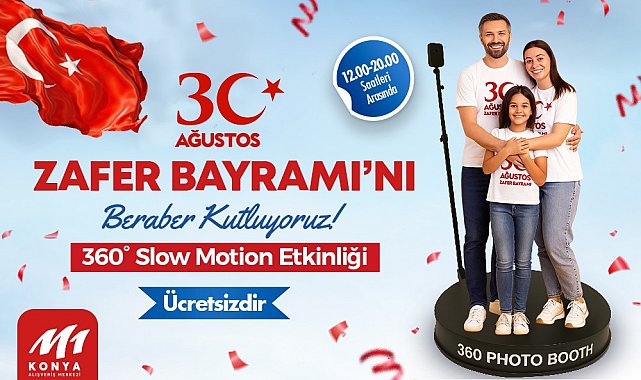 Fiba CP yönetiminde faaliyetlerini sürdüren M1 Konya AVM, 30 Ağustos'un birlik ve beraberlik ruhunu farklı bir deneyimle yaşatıyor. 30 Ağustos günü 12.00-20.00 saatleri arasında gerçekleşecek etkinlikte, ziyaretçiler 360 derece slow motion çekim platformunda özgün videolarla bayram sevincini kaydedecek.