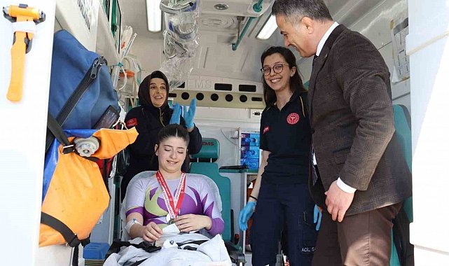 Çorum'da gerçekleştirilen Okullararası Artistik Cimnastik İl Birinciliği Yarışması'nda dereceye giren genç sporcuya kazandığı madalyaları, sakatlanması sebebiyle ambulansta verildi.