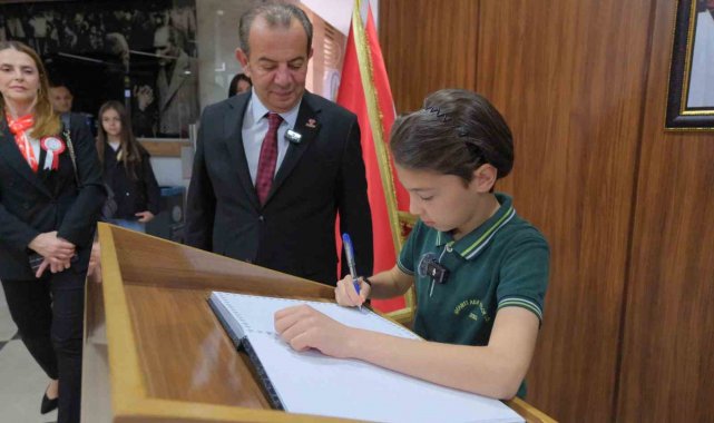 Bolu Belediye Başkanı Tanju Özcan, 23 Nisan Ulusal Egemenlik ve Çocuk Bayramı sebebiyle başkanlık koltuğunu Mehmet Akif Ersoy İlkokulu 4-D sınıfı öğrencisi Ali Ömer İbar'a devretti.