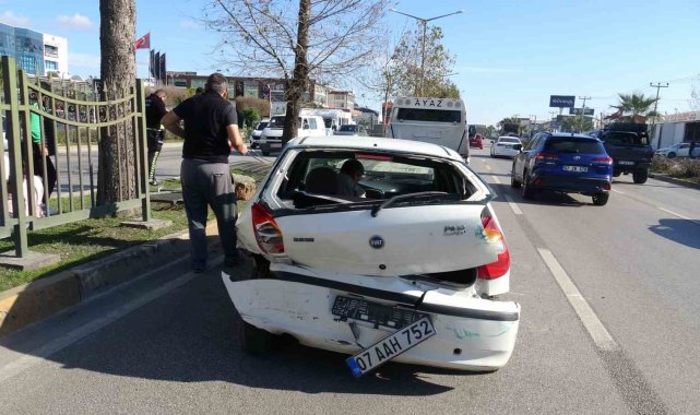 Antalya'da makas attığı iddia edilen aracın çarpması sonucu karşı şeride geçen otomobilde bulunan biri çocuk 2 kişi yaralandı. Kaza anı ise bir iş yerinin güvenlik kamerasına saniye saniye yansıdı.