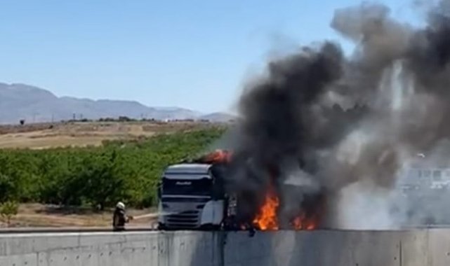 Malatya'da bariyerlere çarpan tır alev aldı