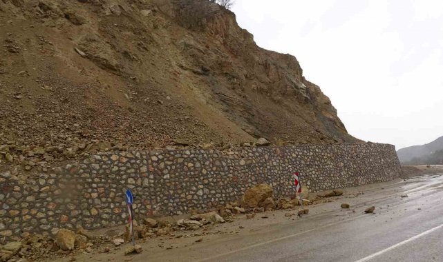 Malatya'nın Arapgir ilçesinde meydana gelen toprak kayması sonucu yola dev kayalar düştü, bölgede çalışma başlatıldı.