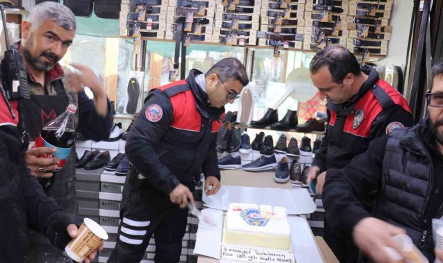 Deprem bölgesi Malatya'da bir grup esnaf, kavga ihbarında bulundukları polis ekiplerine pasta sürprizi yaparak Türk Polis Teşkilatı'nın 180'inci kuruluş yıl dönümü ve Polis Haftası'nı kutladı.