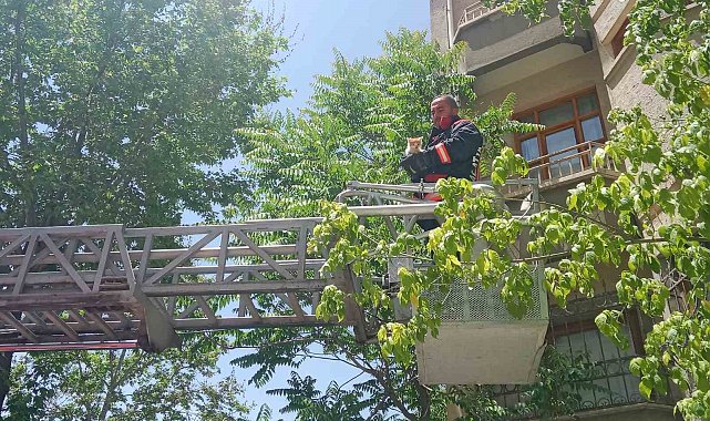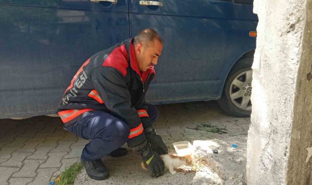 Kısa sürede bölgeye ulaşan ekipler, pencerede sıkışan yavru kediyi merdiven yardımıyla kurtardı.