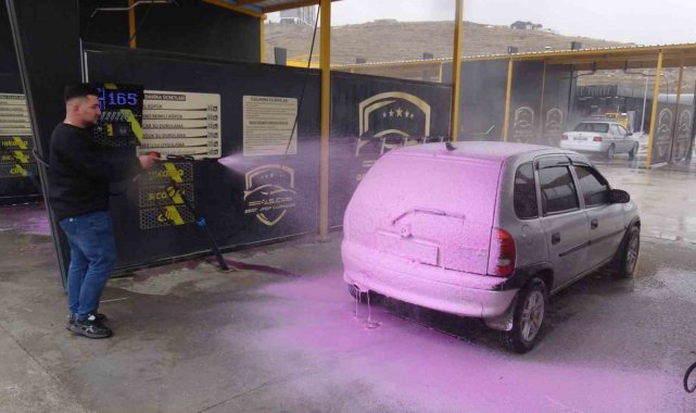 Malatya'da pembe köpükle hizmet veren self oto yıkama servisi, özellikle gençlerin ilgisini çekiyor.