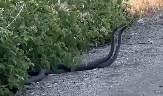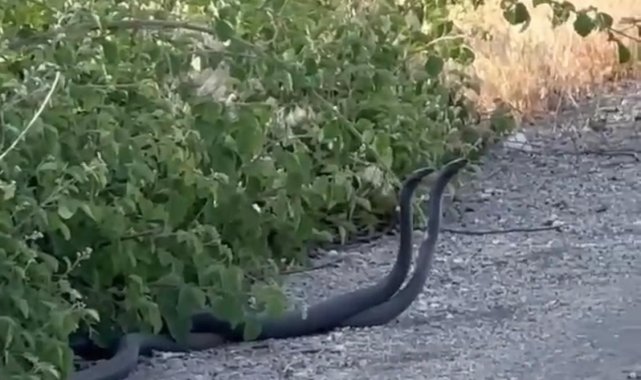 Malatya'nın Doğanşehir ilçesinde, yol kenarında çiftleşme dansı yapan iki yılan vatandaşın cep telefonu kamerasıyla görüntülendi.