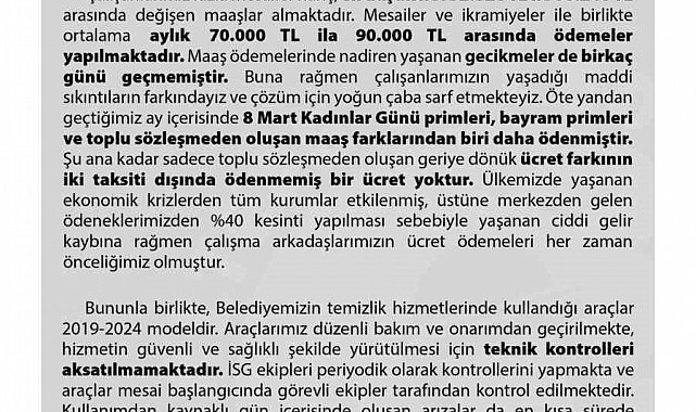 Açıklamada, "Çalışanlarımız fazla mesailer hariç, en düşük net 52.826 TL ile 66.240 TL arasında değişen maaşlar almaktadır. Mesailer ve ikramiyeler ile birlikte ortalama aylık 70.000 TL ila 90.000 TL arasında ödemeler yapılmaktadır. Maaş ödemelerinde nadiren yaşanan gecikmeler de birkaç günü geçmemiştir. Buna rağmen çalışanlarımızın yaşadığı maddi sıkıntıların farkındayız ve çözüm için yoğun çaba sarf etmekteyiz. Öte yandan geçtiğimiz ay içerisinde 8 Mart Kadınlar Günü primleri, bayram primleri ve toplu sözleşmeden oluşan maaş farklarından biri daha ödenmiştir. Şu ana kadar sadece toplu sözleşmeden oluşan geriye dönük ücret farkının iki taksiti dışında ödenmemiş bir ücret yoktur. Ülkemizde yaşanan ekonomik krizlerden tüm kurumlar etkilenmiş, üstüne merkezden gelen ödeneklerimizden yüzde 40 kesinti yapılması sebebiyle yaşanan ciddi gelir kaybına rağmen çalışma arkadaşlarımızın ücret ödemeleri her zaman önceliğimiz olmuştur." denildi.