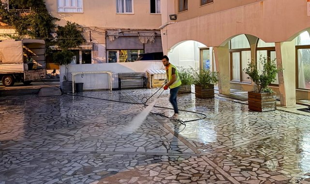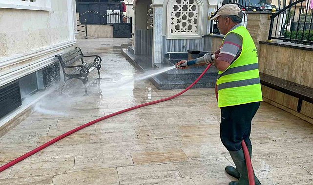 Caminin iç ve dış mekanlarında gerçekleştirilen temizlik çalışmaları kapsamında cami avluları ve abdesthaneler temizleniyor; mihrap, minber ve kürsü gibi alanlar dezenfekte ediliyor.