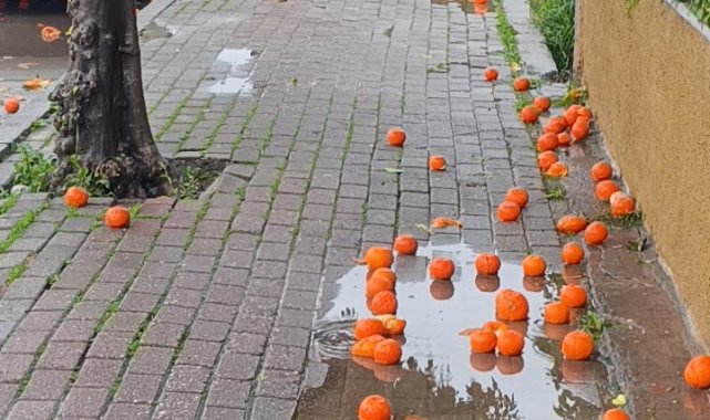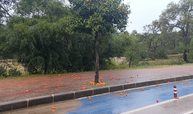 Vitamin ve mineral bakımından zengin içeriğiyle bilinen, ancak büyük bölümü toplanmadan ağaç üzerinde kalan, bazı vatandaşların reçel yapmak amacıyla topladığı turunçlar, ilçede etkili olan şiddetli yağmur ve fırtınanın etkisiyle kaldırım ve yollara savruldu. Etrafa saçılan meyveler düştüğü alanları turuncu renge bürürken, yola dağılan turunçların araçların tekerlekleri altında ezildiği görüldü.