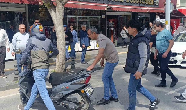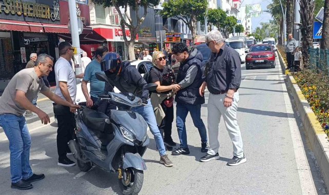 Antalya'nın Manavgat ilçesinde yaya geçidindeki yayalara çarpmamak için ani fren yapan motosiklet sürücüsü, yola savrularak metrelerce sürüklendi. Kask ve koruyucu ekipmanları sayesinde kazayı burnu bile kanamadan atlatan sürücü, kazanın şokunu yol kenarında sigara içerek attı.