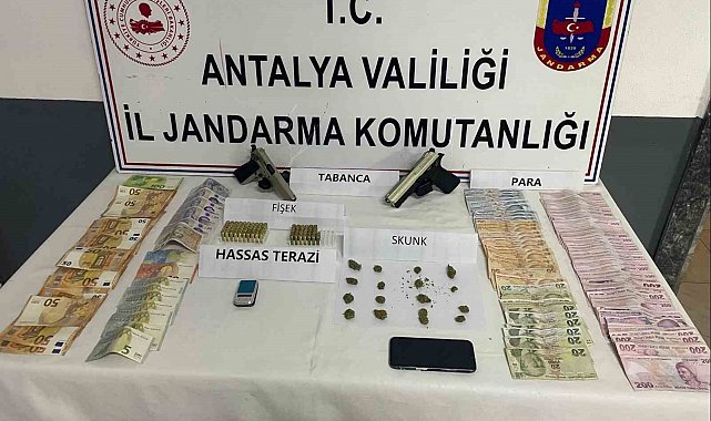 Yapılan aramalarda, 50 gram skunk, 1 hassas terazi, 2 ruhsatsız 9x19 milimetre tabanca, 82 adet 9x19 milimetre tabanca fişeği, 1 cep telefonu, bin 465 avro, 110 sterlin ve 14 bin 50 lira nakit para ele geçirildi.