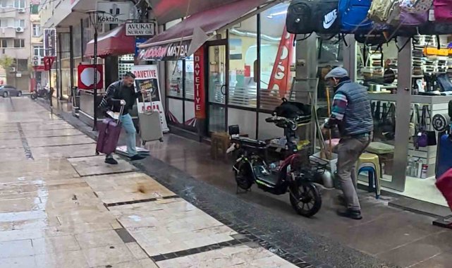 Öte yandan, şiddetli fırtına nedeniyle çantacı dükkanının kapısının önünde duran valizler de sokağa savruldu. Yardım isteyen esnafın sokağa savrulan valizleri komşu esnaf tarafından zarar görmeden kurtarıldı. Valizleri kurtaran komşu esnaf Ahmet Cantür, "Son anda yakaladık. Şiddetli bir rüzgar çıktı. Aşağı doğru uçan valizleri son anda yakaladım" dedi.