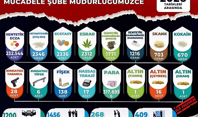 Aramalarda 232 bin 544 adet sentetik ecza hap, 2312 gram esrar, 2346 gram metamfetamin, 1216 gram sentetik kannabinoid hammaddesi, 1771 gram bonzai, 703 gram skunk, 670 gram kokain, 2 bin 336 adet extacy ele geçirildi. Ayrıca 28 ruhsatsız tabanca, 6 ruhsatsız tüfek, 138 fişek, 17 hassas terazi ile uyuşturucudan elde edildiği değerlendirilen 317 bin 695 TL, 16 çeyrek altın, 1 yarım altın ve 1 gram altına da el konuldu.