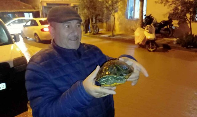 Sağanak yağışın beraberinde getirdiği sel suları sadece araçları değil, yaban hayatını da olumsuz etkiledi. Akıntının şiddetiyle sürüklenen bir kaplumbağayı fark eden vatandaşlar, kendi imkanlarıyla müdahale ederek hayvanı suyun içinden çıkardı.