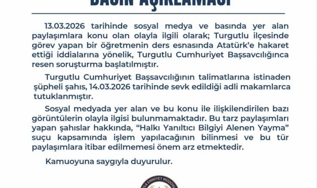 "13.03.2026 tarihinde sosyal medya ve basında yer alan paylaşımlara konu olan olayla ilgili olarak; Turgutlu ilçesinde görev yapan bir öğretmenin ders esnasında Atatürk'e hakaret ettiği iddialarına yönelik, Turgutlu Cumhuriyet Başsavcılığınca resen soruşturma başlatılmıştır. Turgutlu Cumhuriyet Başsavcılığının talimatlarına istinaden şüpheli şahıs, 14.03.2026 tarihinde sevk edildiği adli makamlarca tutuklanmıştır. Sosyal medyada yer alan ve bu konu ile ilişkilendirilen bazı görüntülerin olayla ilgisi bulunmamaktadır. Bu tarz paylaşımları yapan şahıslar hakkında, 'Halkı Yanıltıcı Bilgiyi Alenen Yayma' suçu kapsamında işlem yapılacağının bilinmesi ve bu tür paylaşımlara itibar edilmemesi önem arz etmektedir."