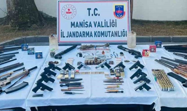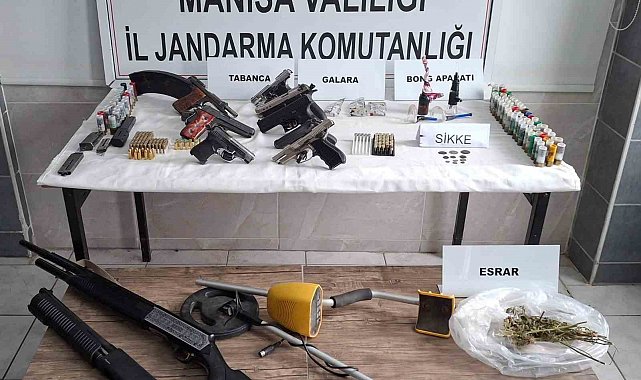 Manisa İl Jandarma Komutanlığı KOM Şube Müdürlüğünce Turgutlu ve Salihli ilçelerinde 'Uyuşturucu madde imalatı, 'Silah ticareti' ve 'Kaçakçılık' suçlarına yönelik, JASAT, Turgutlu ve Salihli İlçe Jandarma Komutanlıkları ekiplerince 41 adreste 44 şüpheli şahsın evinde eş zamanlı arama yapıldı. Yapılan aramalarda, 10 adet ruhsatsız tabanca, 11 adet kurusıkı tabanca, 33 adet tüfek, 2 adet şarjör, 298 adet tabanca fişeği, 222 adet tüfek kartuşu, 133 adet kurusıkı tabanca fişeği, 8 adet bıçak, 160 gram kubar esrar, 3 gram metamfetamin, 6 adet sentetik ecza hapı, 5 kök kenevir bitkisi, 2 adet hassas terazi, 2 adet esrar öğütme aparatı, 19 adet uyuşturucu madde kullanma aparatı, 1 adet dedektör, 11 adet sikke ele geçirildi.