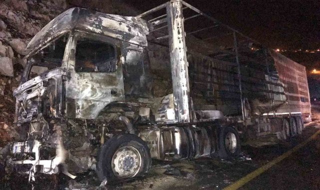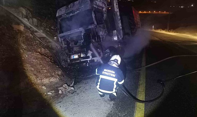 Mardin'in Artuklu ilçesinde alevlere teslim olan tır, kullanılamaz hale geldi.