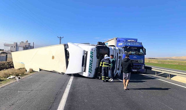 Mardin'in Nusaybin ilçesinde kontrolden çıkan peynir yüklü tırın devrilmesi sonucu meydana gelen trafik kazası maddi hasarla atlatıldı.
