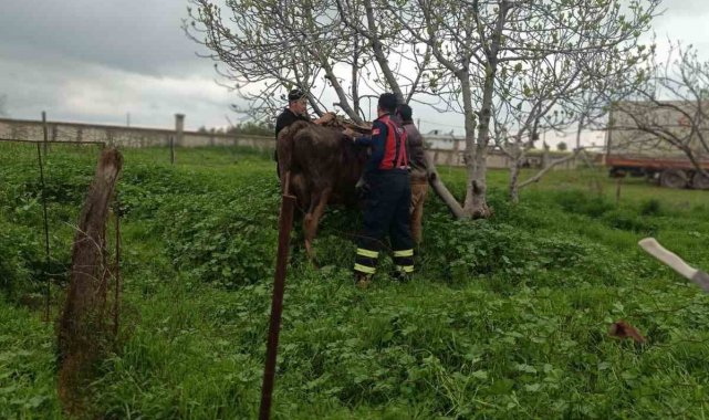 Mardin'in Artuklu ilçesinde, kuyuya düşen inek, itfaiye ekiplerince kurtarıldı.
