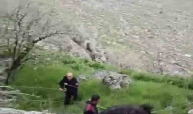 Mardin'in Nusaybin ilçesinde dağlık alanda mahsur kalan 2 keçi, itfaiyenin çalışmasıyla kurtarıldı.