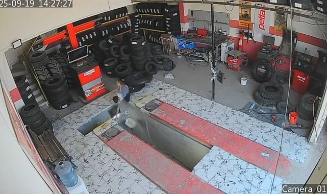 Mardin'in Mazıdağı ilçesinde bir oto lastikçiden çalışan çocuğun çukura düşme anı güvenlik kamerasına yansıdı.